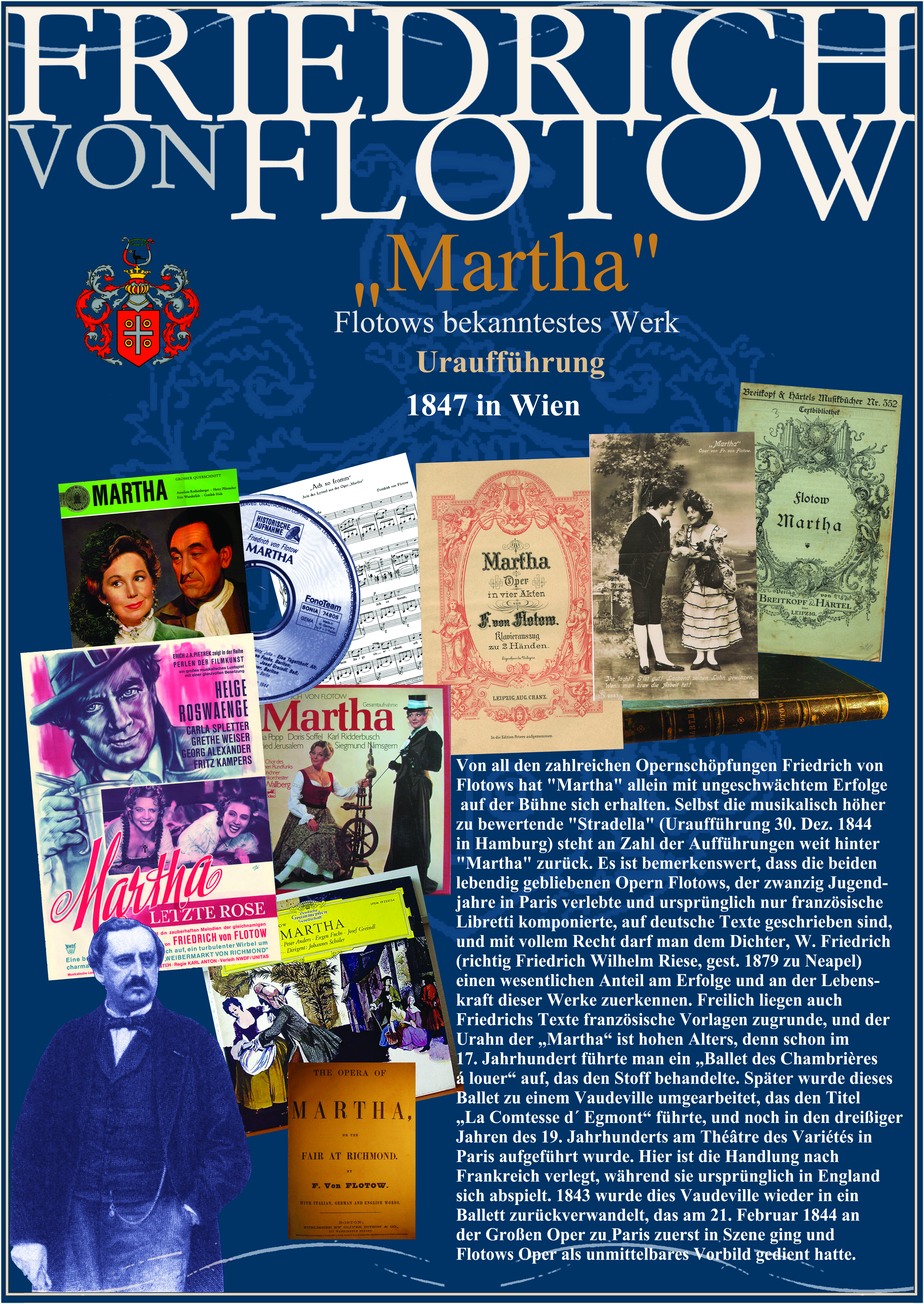 Von all den zahlreichen Opernschöpfungen Friedrich von Flotows hat "Martha" allein mit ungeschwächtem Erfolge auf der Bühne sich erhalten. Selbst die musikalisch höher zu bewertende "Stradella" (Uraufführung 30. Dez. 1844 in Hamburg) steht an Zahl der Aufführungen weit hinter